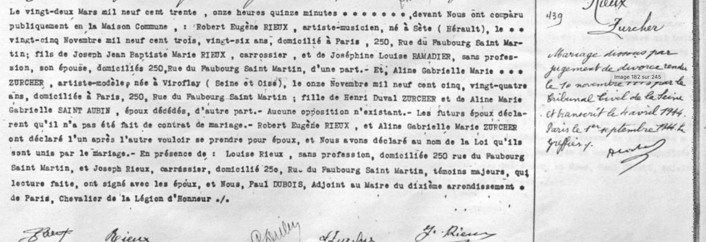 Ce recensement de 1911 (geneanet.org), apprend qu'il est né à Sète en 1903 et qu'il habite avec sa famille au Pré Saint Gervais en Seine-St Denis). Il se marie à Paris en 1930 avec Aline Zurcker dont il divorce en 1942.
