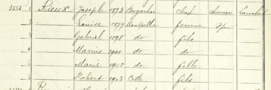 - Marius Joseph, né à Montpellier en 1900, menuisier. Il se marie à Paris en 1920 avec Lucienne Jeanne Stique dont il divorce en 1928. Le 2 août 1930, il épouse à Caudiès en seconde noce Joséphine Vidal (1907-1988), infirmière à Paris (A.P. - H.P. entre 1937 et 1965). Ce frère décède en octobre 1931 (à 31 ans, à l'hôpital Lariboisière à Paris) alors que sa femme est enceinte.